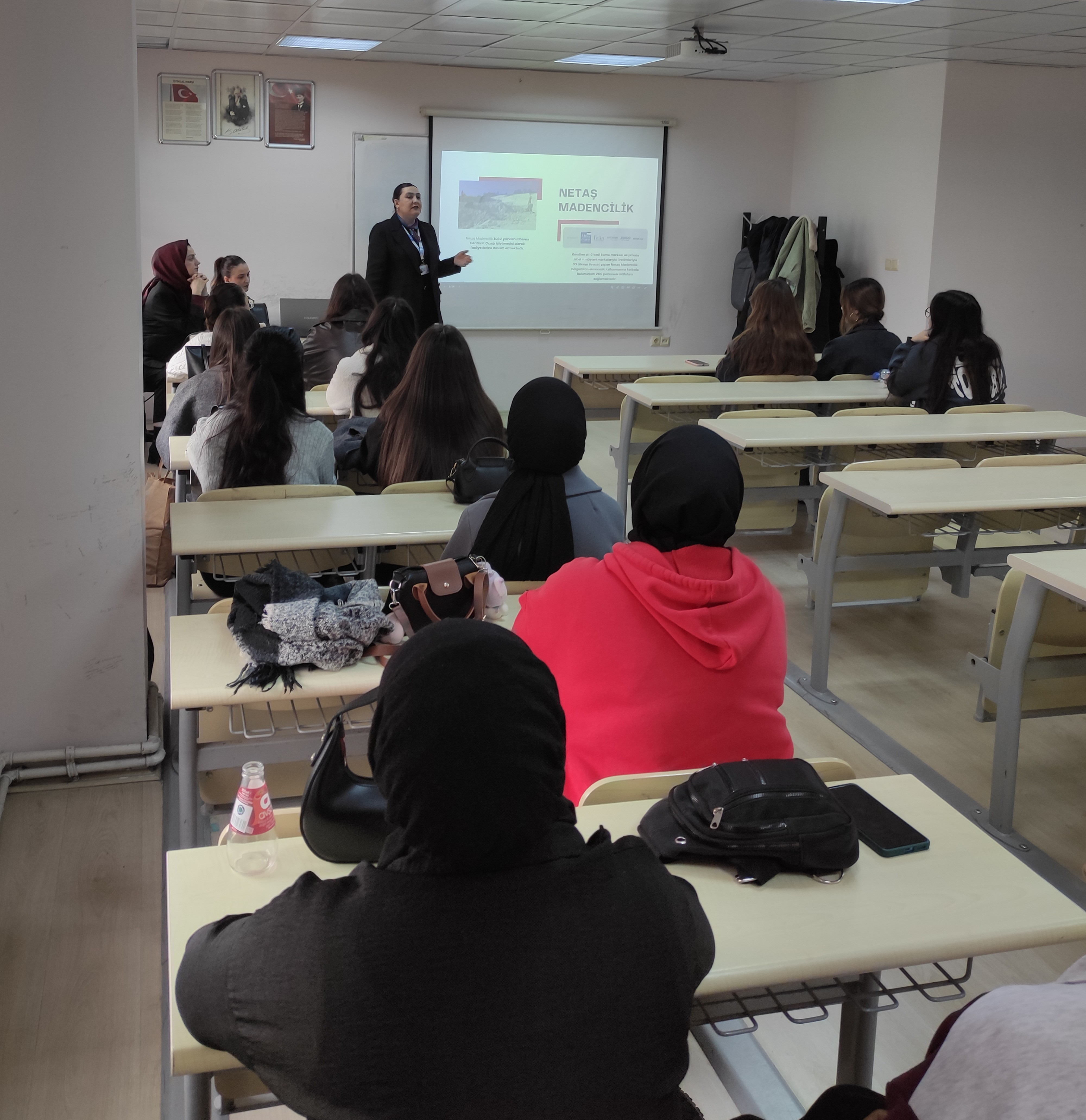 Öğr. Gör. Ayşe KOCA tarafından yürütülen Eğitim Geliştirme ve Kariyer Yönetimi dersi kapsamında, Netaş Madencilik firmasından İnsan Kaynakları Organizasyonel Gelişim Uzmanı Büşra SIRIMSI BAYATA, İnsan Kaynakları Görevlisi Begüm SÖZEN ve İlayda ŞANLI öğrencilerimizle bir araya geldi. Düzenlenen etkinlikte, sektörün insan kaynağı beklentileri, işe alım süreçleri ve kariyer planlaması konularında önemli bilgiler paylaşıldı.